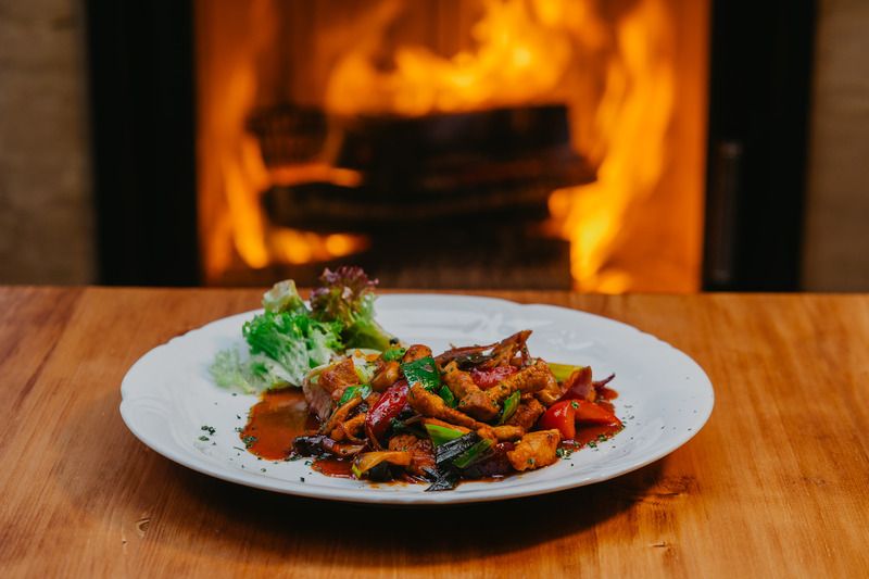vepřové nudličky, cibule, chilli, paprika, smetana