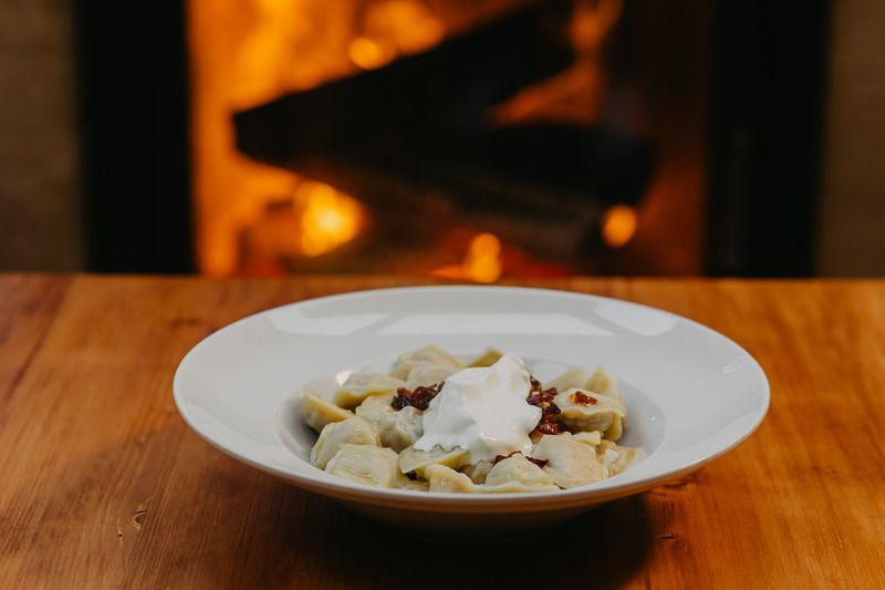 plněné mletým masem, smažená cibulka, zakysaná smetana